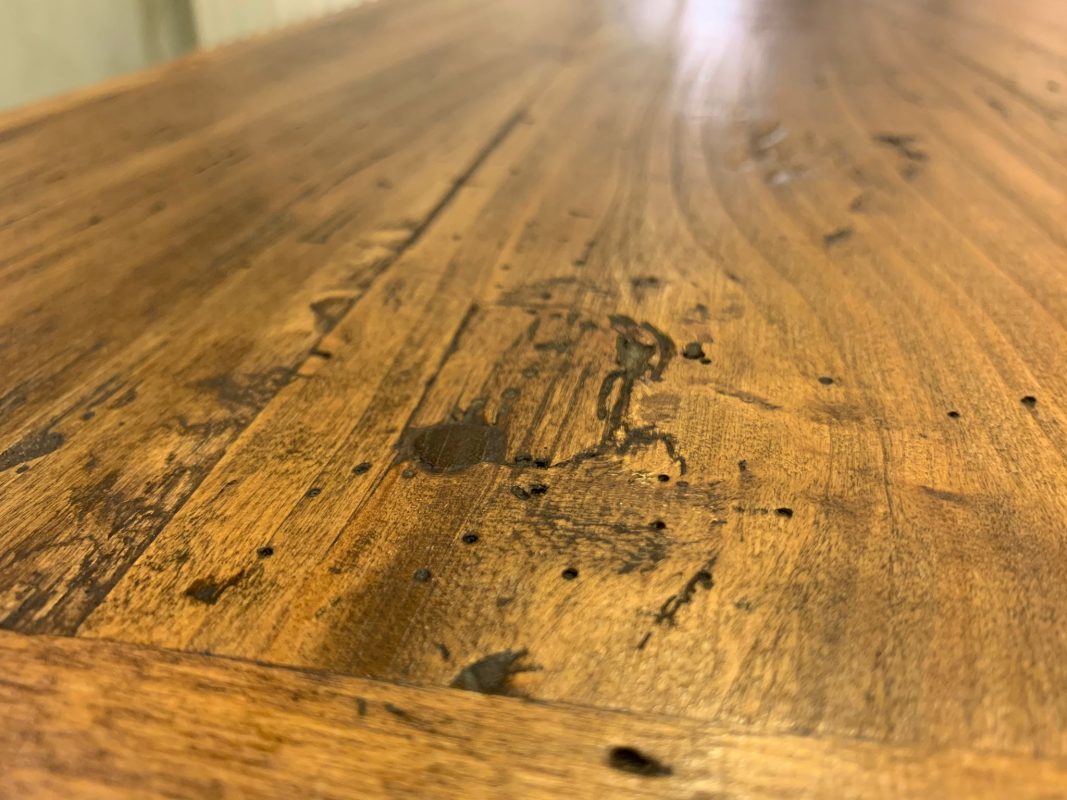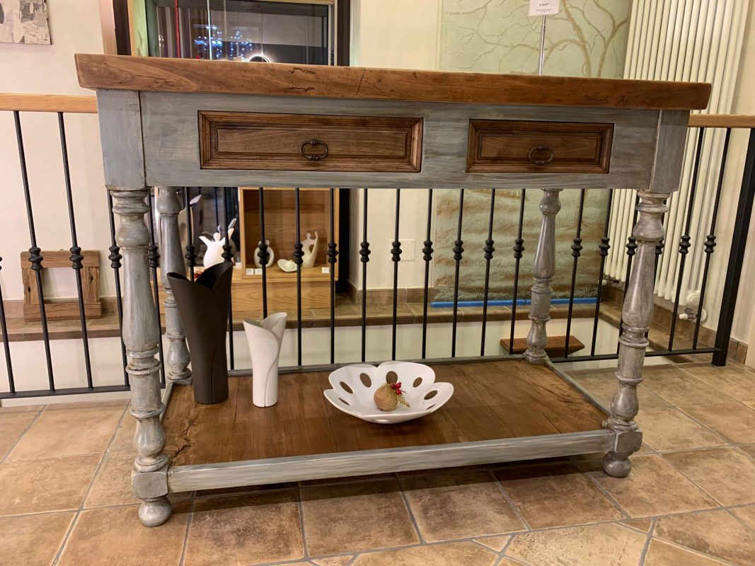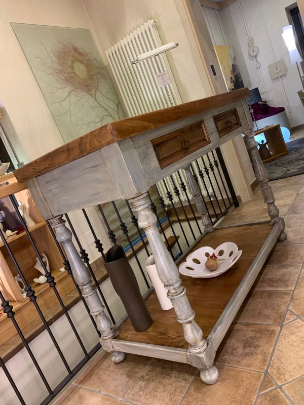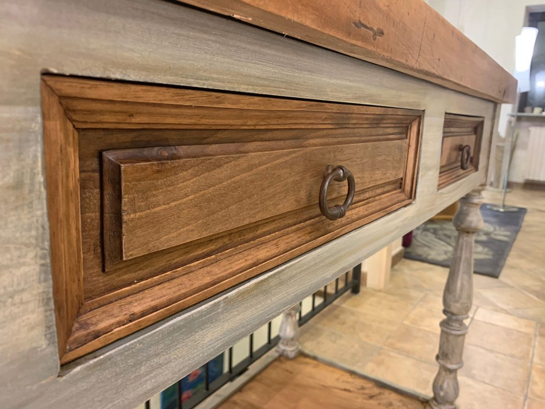 Banco da cucina artigianale con cassetti in legno di pioppo vecchio, dimensioni massime cm 130L x 61.5P x 100H circa.