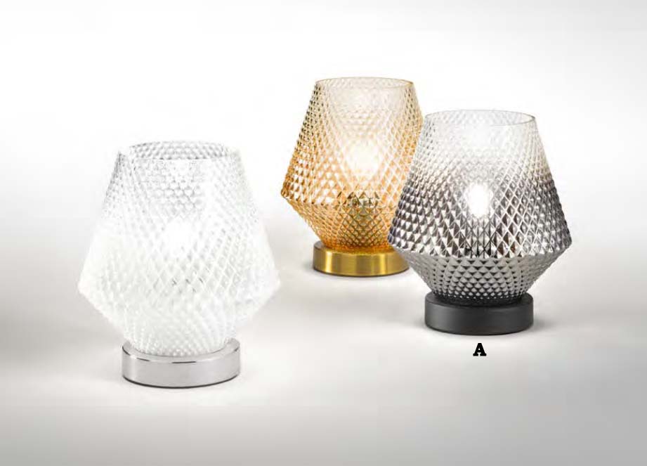 Lampada da tavolo (A) Perenz con montatura in metallo colore nero opaco e vetro lavorato fumé specchiato sfumato, dotata di interruttore sul cavo rivestito in tessuto colore nero, attacco E27 da 60 Watt max, dimensioni massime cm 20x20x23h.