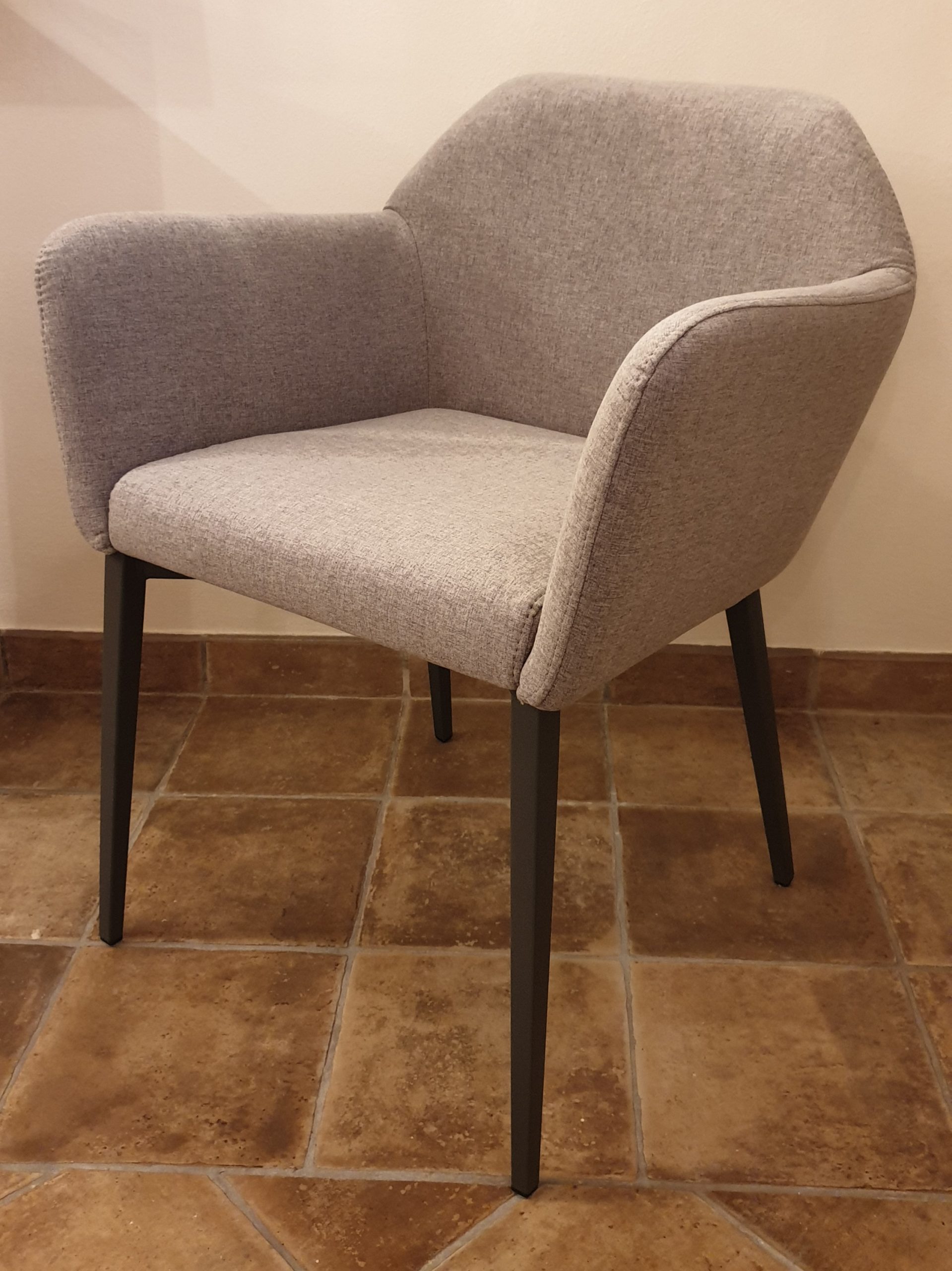 Sedia / poltroncina imbottita, modello Brooke, in tessuto completamente sfoderabile, colore grigio melange, con struttura e piedi in metallo, finitura grigio antracite, dimensioni massime cm 60x57x76h.