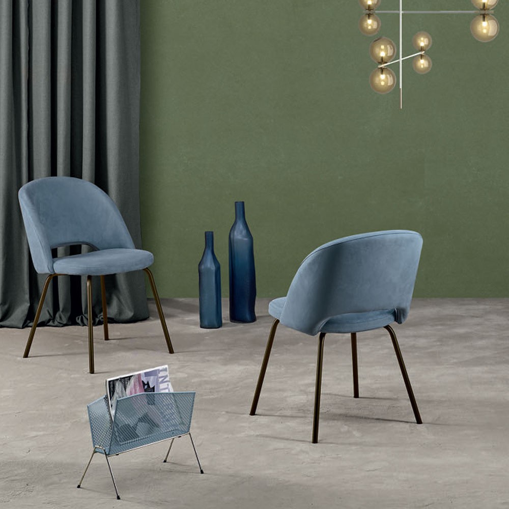 Sedia / poltroncina imbottita, modello Ginger, in tessuto completamente sfoderabile, colore azzurro polvere, con struttura in legno e piedi in metallo, finitura bronzo, dimensioni massime cm 53x61x79h.