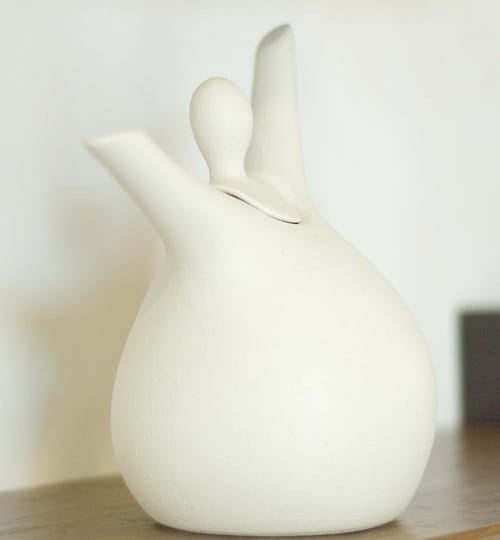 Dall’idea dell’artista di stilizzare due figure antropomorfe, sono nate le teiere, Teseo e Teresa. Volendo, possono essere usate l’una per servire in tavola il caffè e l’altra il tè. Teseo, del resto, più piccola ma slanciata, meglio di presta per forma e dimensioni al servizio del caffè. Teresa, bassa e panciuta, è felice del suo ruolo di teiera domestica con l’abitudine di essere usata alle cinque del pomeriggio.